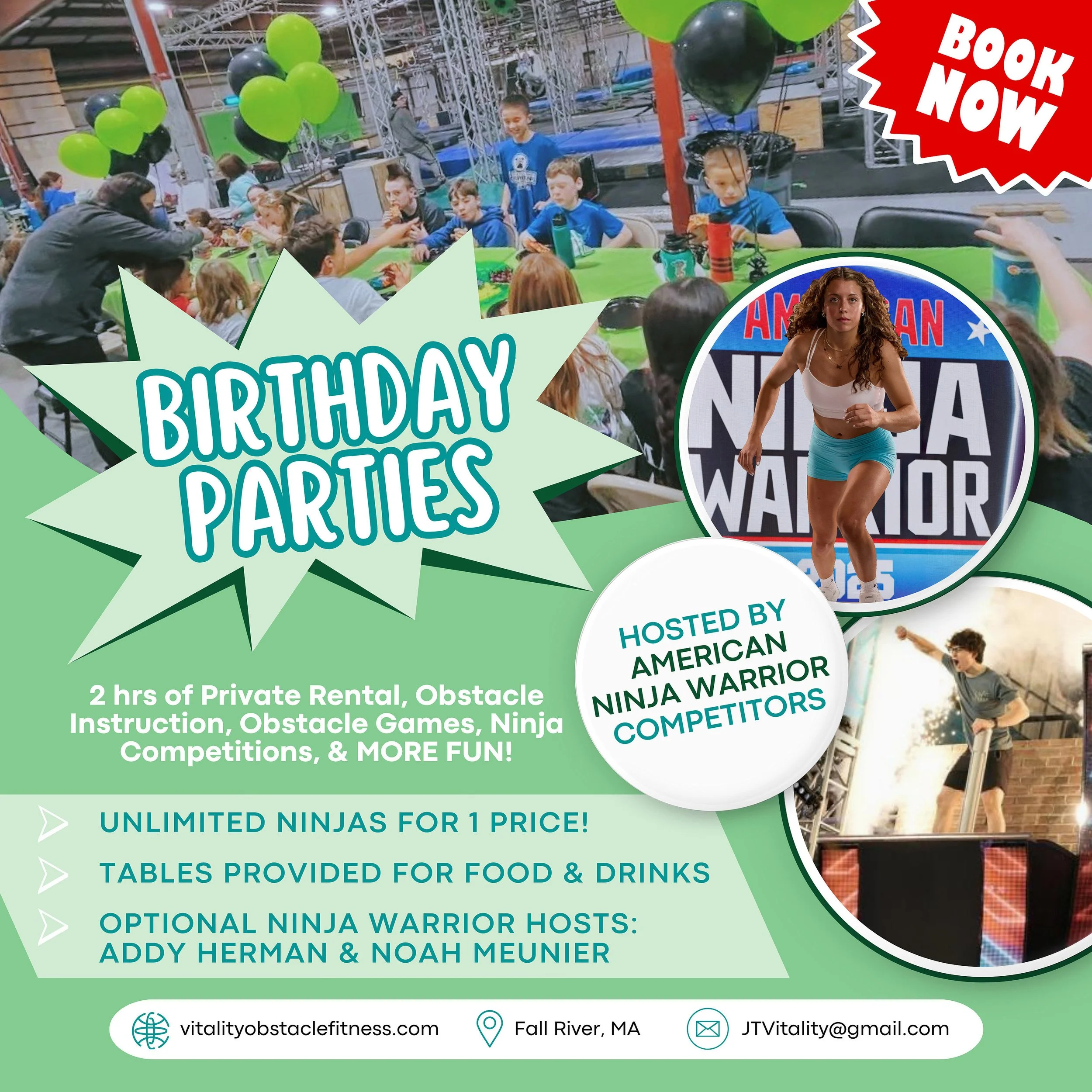 NOW Introducing American Ninja Warrior Birthday Parties with your very own American Ninja Warrior as Host! Parties with Noah Meunier or Addy Herman!!